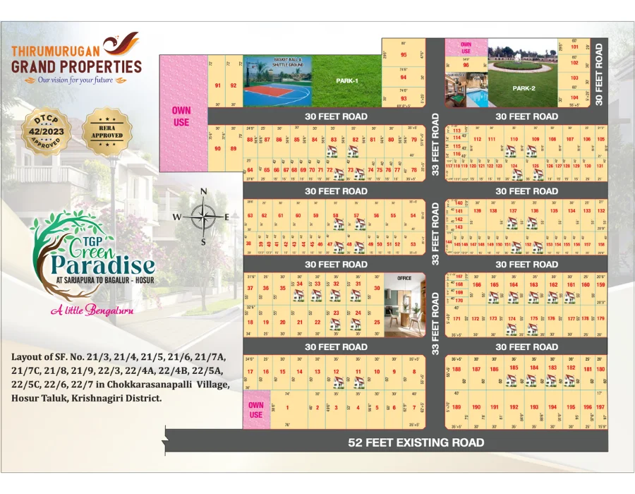 TGP Green Paradise is developed by Thirumurugan Grand Properties, a real estate company with offices in major cities of Tamil Nadu, including Salem, Hosur, Vellore, Coimbatore, Namakkal, and Bengaluru in Karnataka.